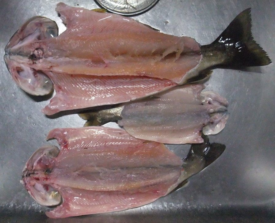 内臓とエラを取った後、腹側から身を開く(腹開き)。
